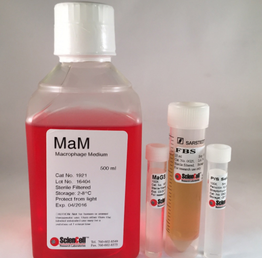 巨噬細(xì)胞培養(yǎng)基包含500 ml基礎(chǔ)培養(yǎng)基,25ml胎牛血清(FBS,貨號(hào):0025),5ml巨噬細(xì)胞生長添加物(MaGS,貨號(hào):1972),和5 ml青霉素/鏈霉素溶液(P/S,貨號(hào):0503)